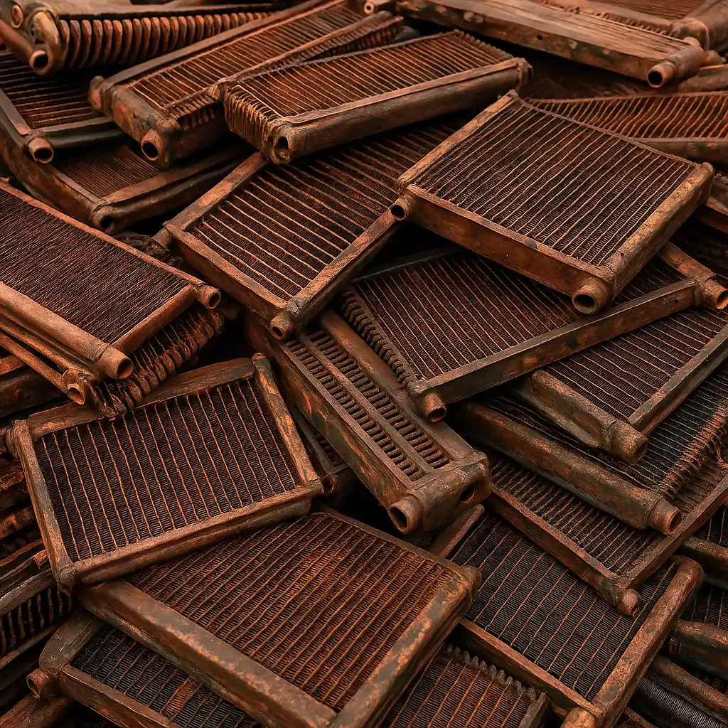 Collected from industrial and vehicle radiators, this scrap contains copper tubes and fins ideal for recycling and recovery through refining processes.